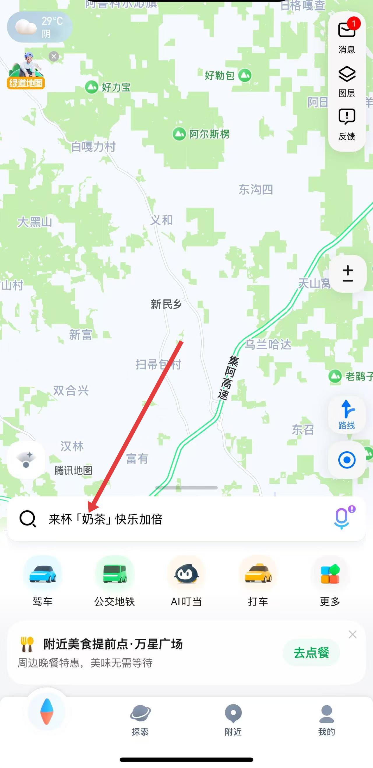1、打开腾讯地图APP,在主界面中找到搜索栏,点击搜索栏输入想要查找的地点。