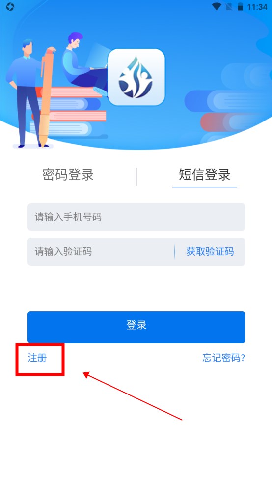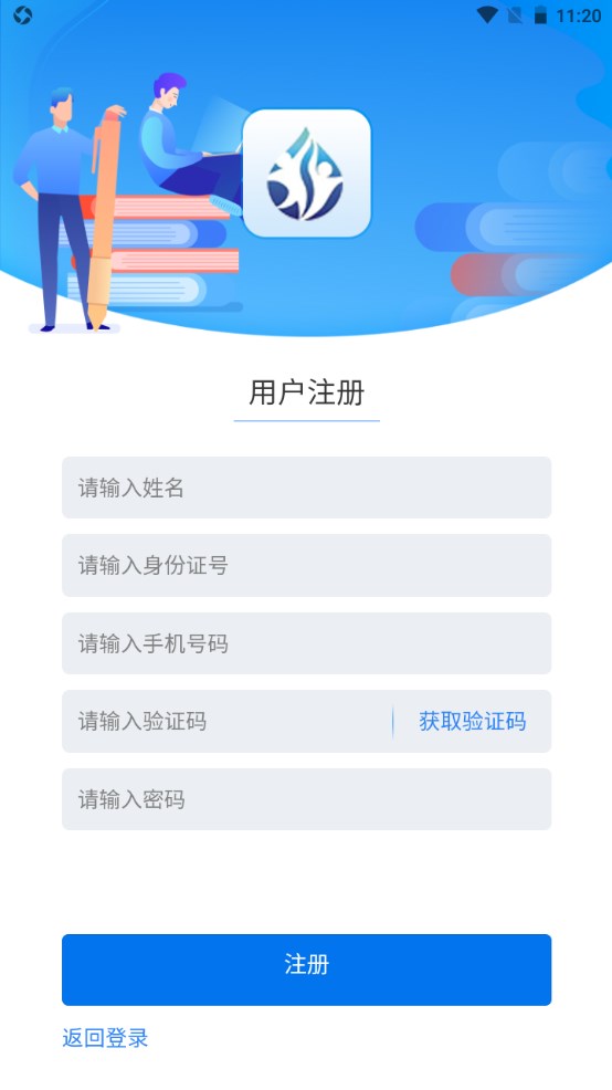 2.输入姓名、身份证号码、手机号获取验证码、自定义密码,点击注册即可。