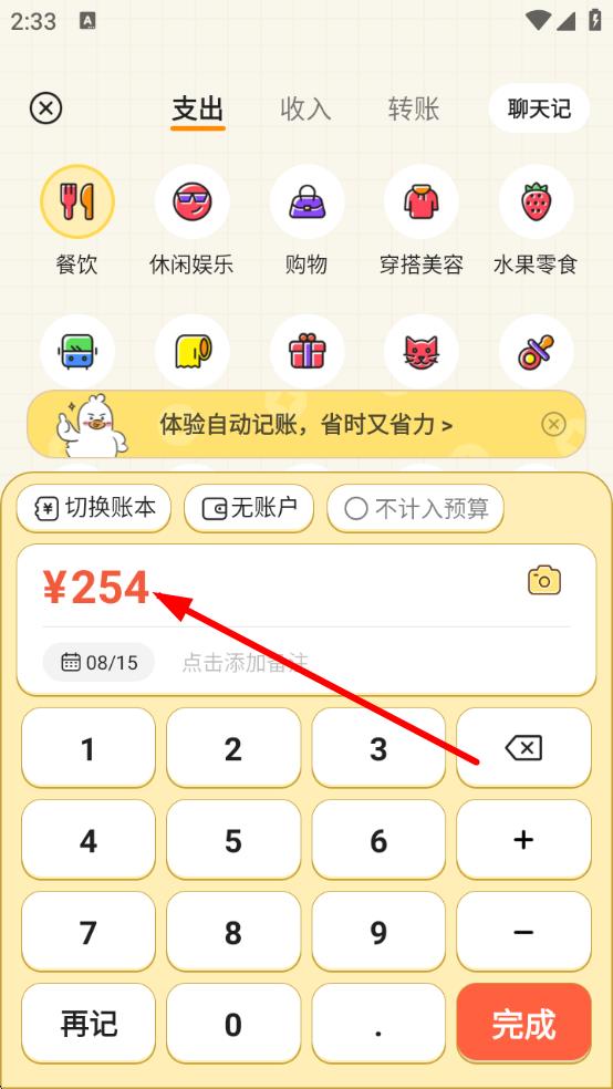 3、进入记账流程,在支出分类下,输入金额选择消费类别,完善记账信息后,点击完成记录收支,推进记账任务。