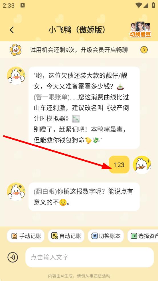 2、在与小飞鸭聊天界面,按指引发送内容,触发角色回应,同时可利用下方手动记账的功能,关联聊天进行记账。