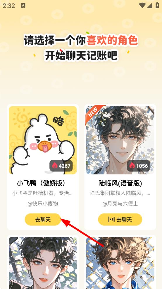 1、进入角色选择界面,挑选喜欢的角色小飞鸭,点击对应角色下方去聊天的按钮,开启聊天记账互动。