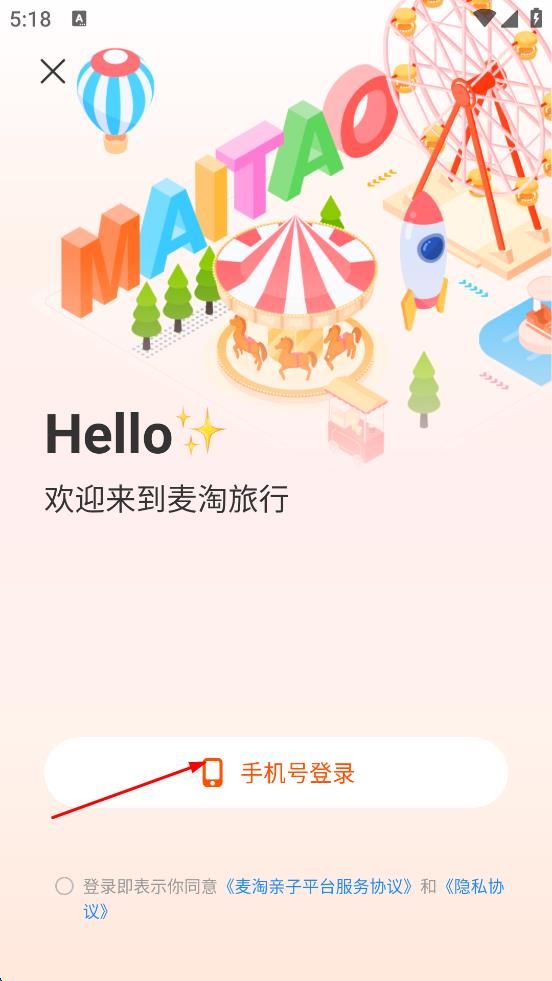 1、打开麦淘旅行软件,在欢迎页面点击“手机号登录”按钮,勾选同意相关协议后,完成登录操作,进入软件首页。