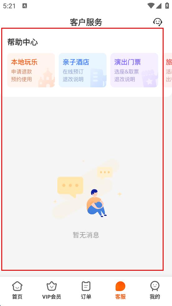3、进入客户服务页面后,可在帮助中心板块选择相关服务分类,如本地玩乐、亲子酒店等,查看对应的服务说明,也可等待客服消息,以便获取帮助。