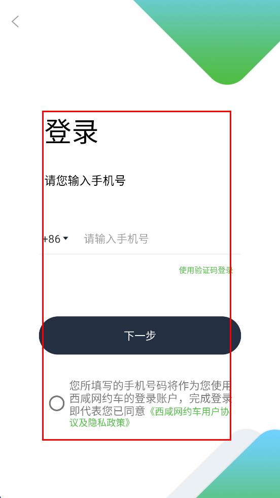 1、打开西咸网约车软件,进入登录页面,在“请输入手机号”输入框中输入手机号码,勾选同意相关协议后,点击“下一步”按钮,完成登录操作。