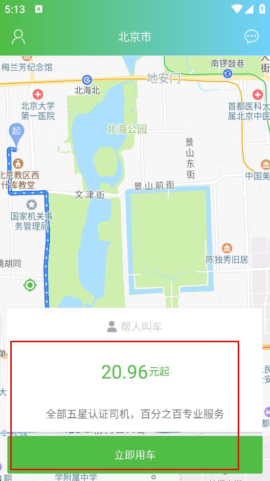 3、输入出发地和目的地后,系统会显示出预估的打车费用以及相关服务说明,确认信息无误后,点击“立即用车”按钮,即可下单等待司机接单。