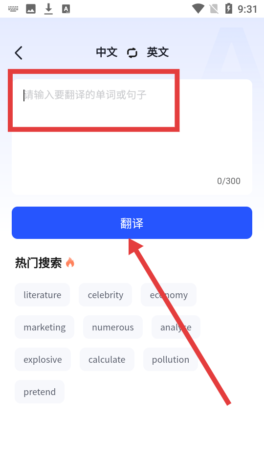 2、进入单词查询页面,在输入框中输入要查询的单词或句子。