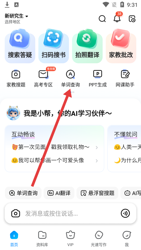 1、打开作业帮APP,在首页点击单词查询图标,进入单词查询页。