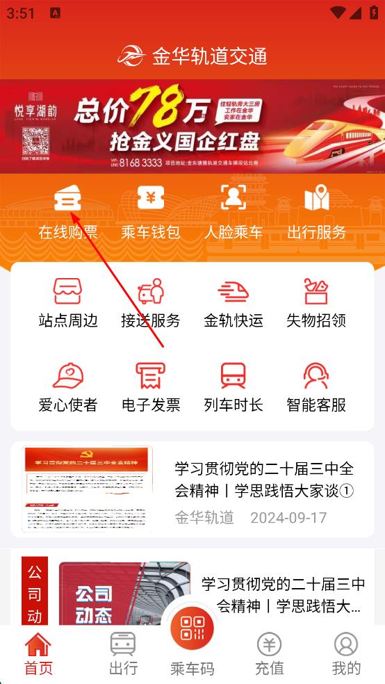 2、登录后回到首页,点击在线购票选项,进入购票界面,可根据需求选择购票相关操作,如选择站点、票数等。