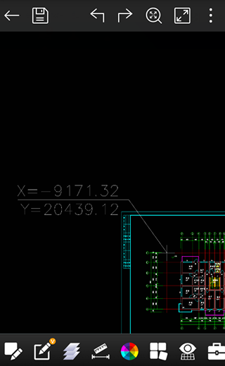 3、然后在图纸点击需要标注的位置,这个时候单指长按屏幕,可以弹出捕捉框,这样就可以根据捕捉点精确选择需要标注的位置。下方会显示对应的坐标点数字,如果确定坐标点正确,那么在需要标注坐标文字的地方点击一下,就会生成坐标标注。