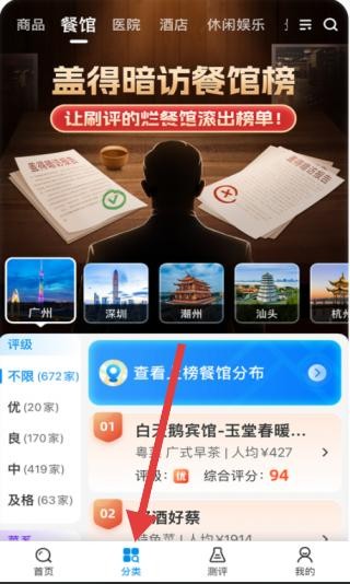 3、以盖得暗访餐馆榜为例,可按城市查看上榜餐馆,了解餐馆评级、名称、菜系、人均消费、评分等信息,辅助大家消费决策。