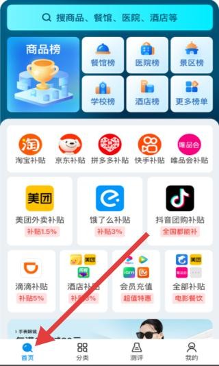 2、进入APP首页有商品榜、餐馆榜等多种榜单,还有各平台补贴入口,通过底部首页、分类等导航栏可切换功能页面,方便查找各类信息。