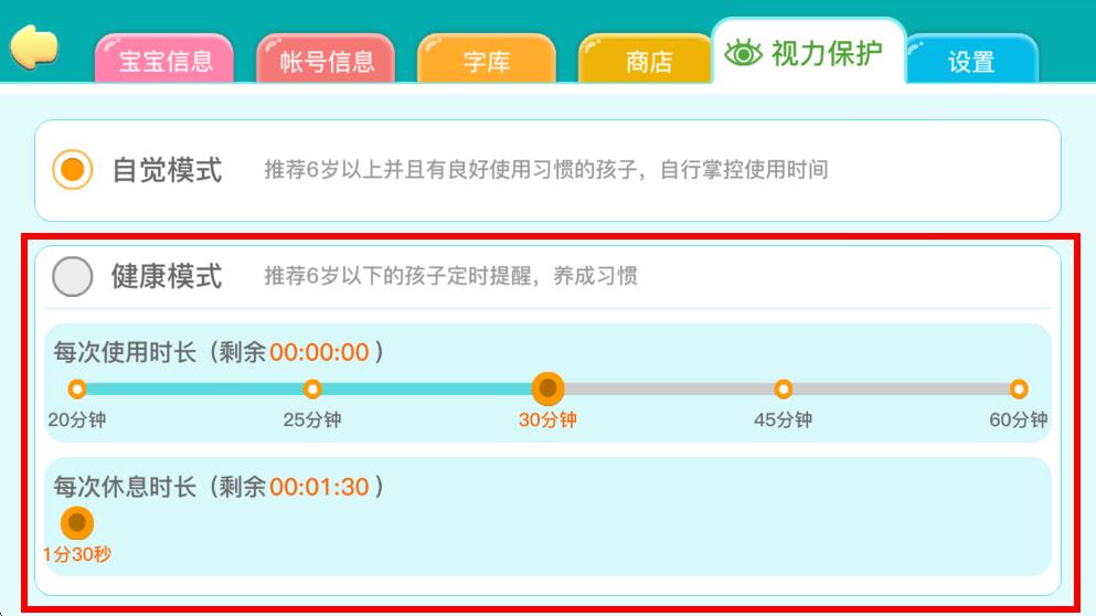 3、在视力保护设置界面中,选择健康模式选项,根据需求设置,合理规划孩子的学习和休息时间,保护孩子视力。