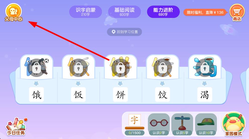 1、打开小伴龙识字app,在主界面左上角找到父母中心图标,点击进入家长设置区域。