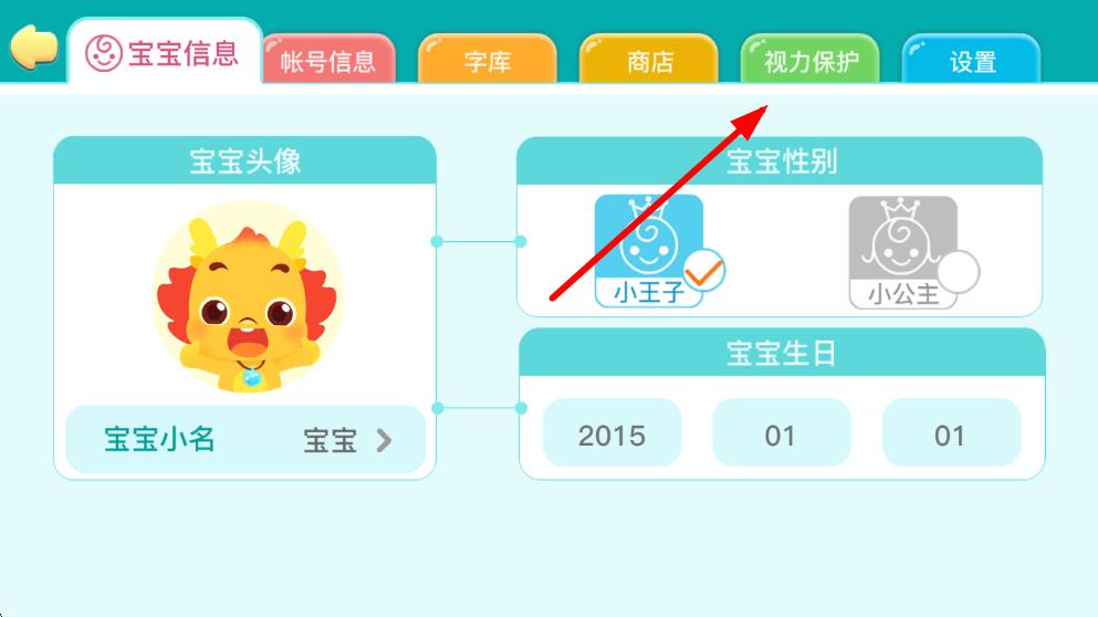 2、通过家长验证进入后,在页面上方的导航栏中找到并点击视力保护选项。