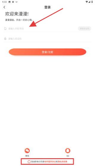 3、输入手机号码,获取并填写验证码后,需要勾选正下方的用户协议,再点击登录/注册。
