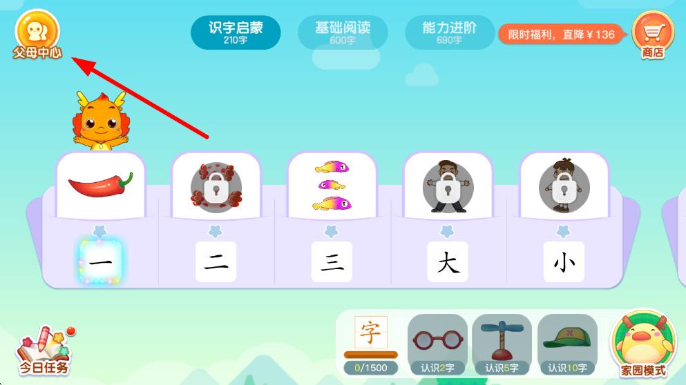 1、打开小伴龙识字app,在主界面左上角找到父母中心图标并点击,进入相关验证环节。