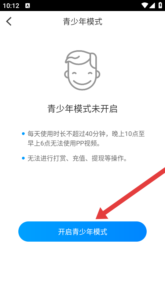 3、在青少年模式页面,点击开启青少年模式按钮,随后按照提示设置独立密码,即可成功开启青少年模式。