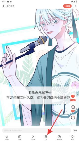 3、点击屏幕展示出功能栏目,再找到打赏按钮并点击,选择打赏金额或道具,确认后即可完成打赏。