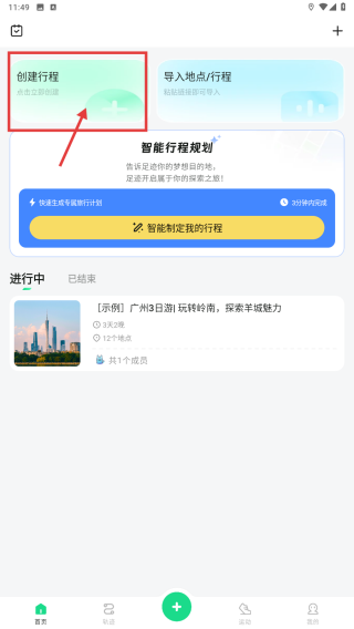 1、打开旅行行程规划类应用,点击创建行程选项,进入旅行取名页面。