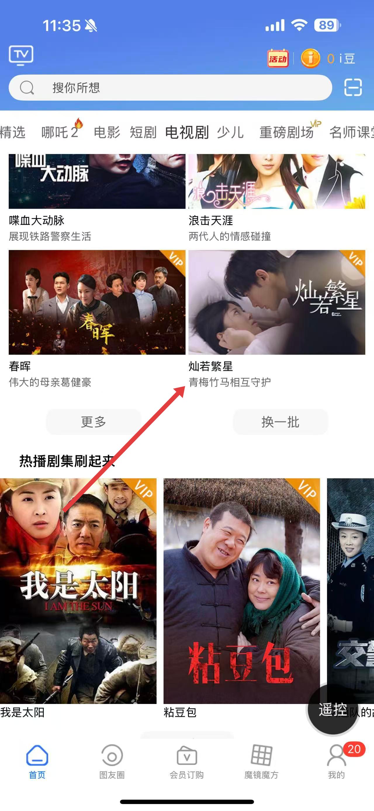 1、打开i视APP,在首页的精选等栏目中,选择想要投屏观看的电视剧,例如灿若繁星。