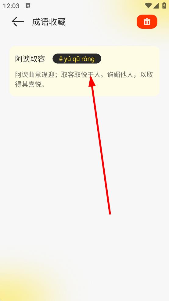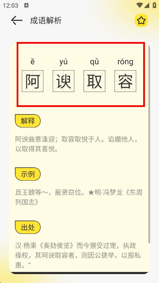 3、在成语解析页面,可将成语收藏,收藏后在成语收藏页面能查看已收藏的成语。