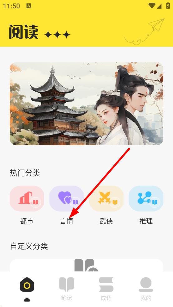 1、在阅读页面,点击言情分类,进入言情分类页面。