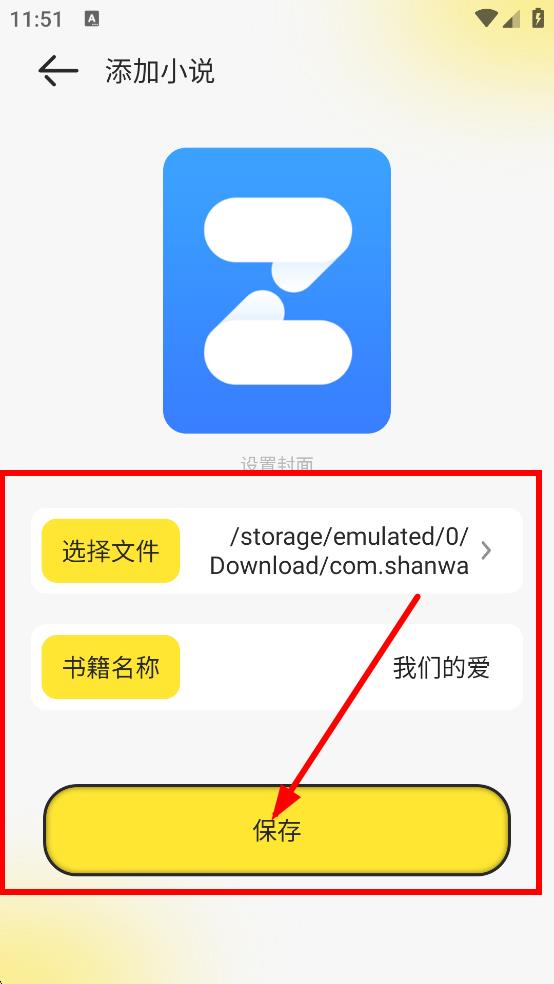 3、在添加小说页面,选择文件并输入书籍名称后,点击保存,添加小说。