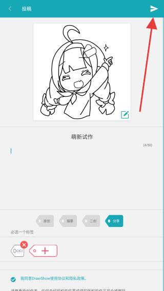 3、进入作品投稿页面,填写作品标题,添加至少一个标签,确认信息无误后,点击页面右上角的发送,即可完成作品发布。