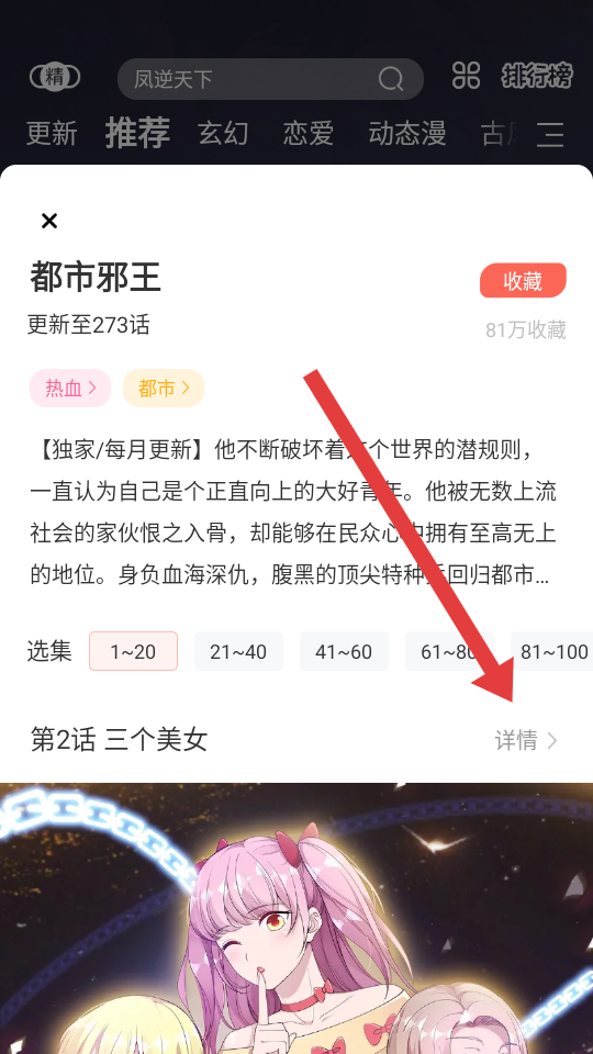 2、在漫画的初步介绍页面,找到并点击详情按钮,进入漫画的详细信息页面。