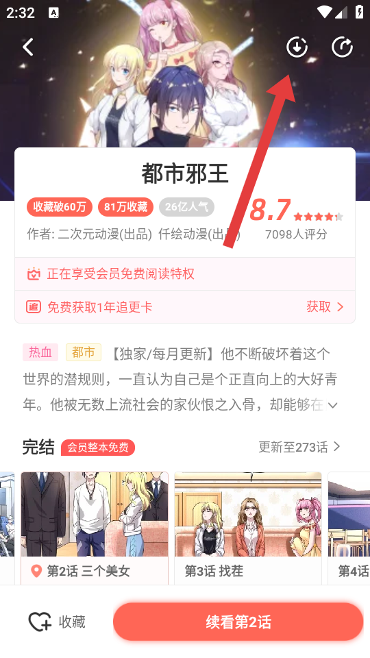 3、进入漫画详细信息页面后,点击右上角的下载图标,后续选择需要下载的章节。