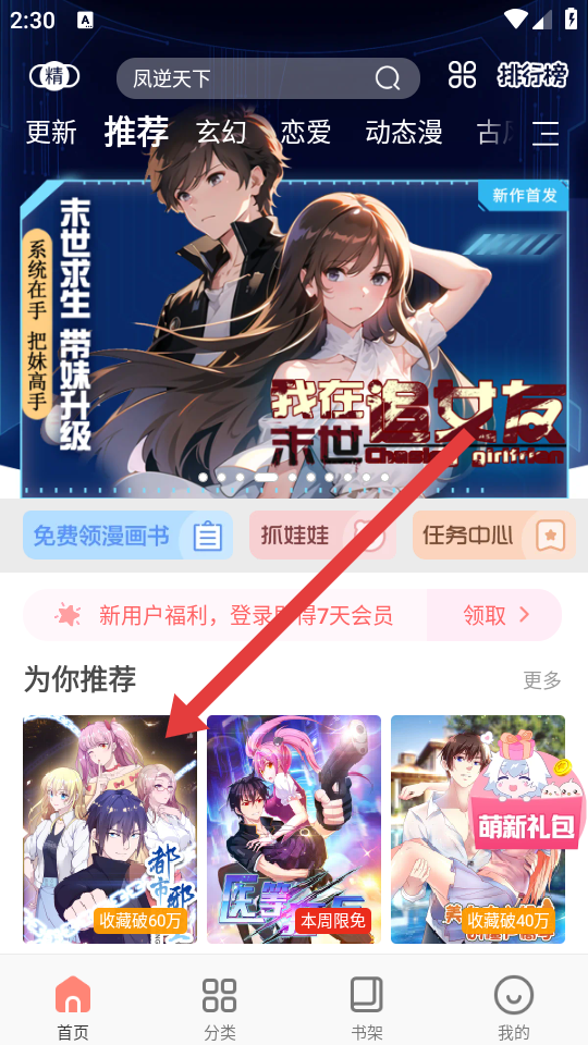 1、打开飒漫画APP,在首页的为你推荐等板块中,挑选想要下载的漫画,点击漫画的封面或标题。