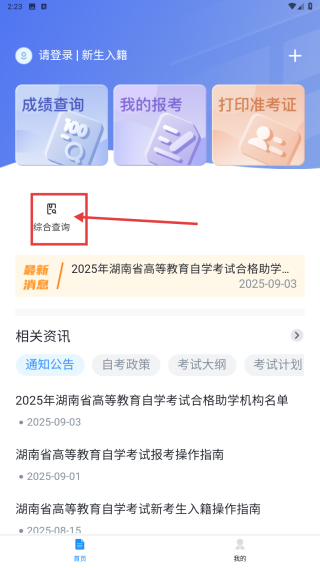 1、打开湖南自考相关应用,点击综合查询选项,进入综合查询页面。
