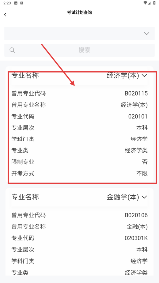 3、在考试计划查询页面,可查看如经济学本等专业的曾用专业代码。