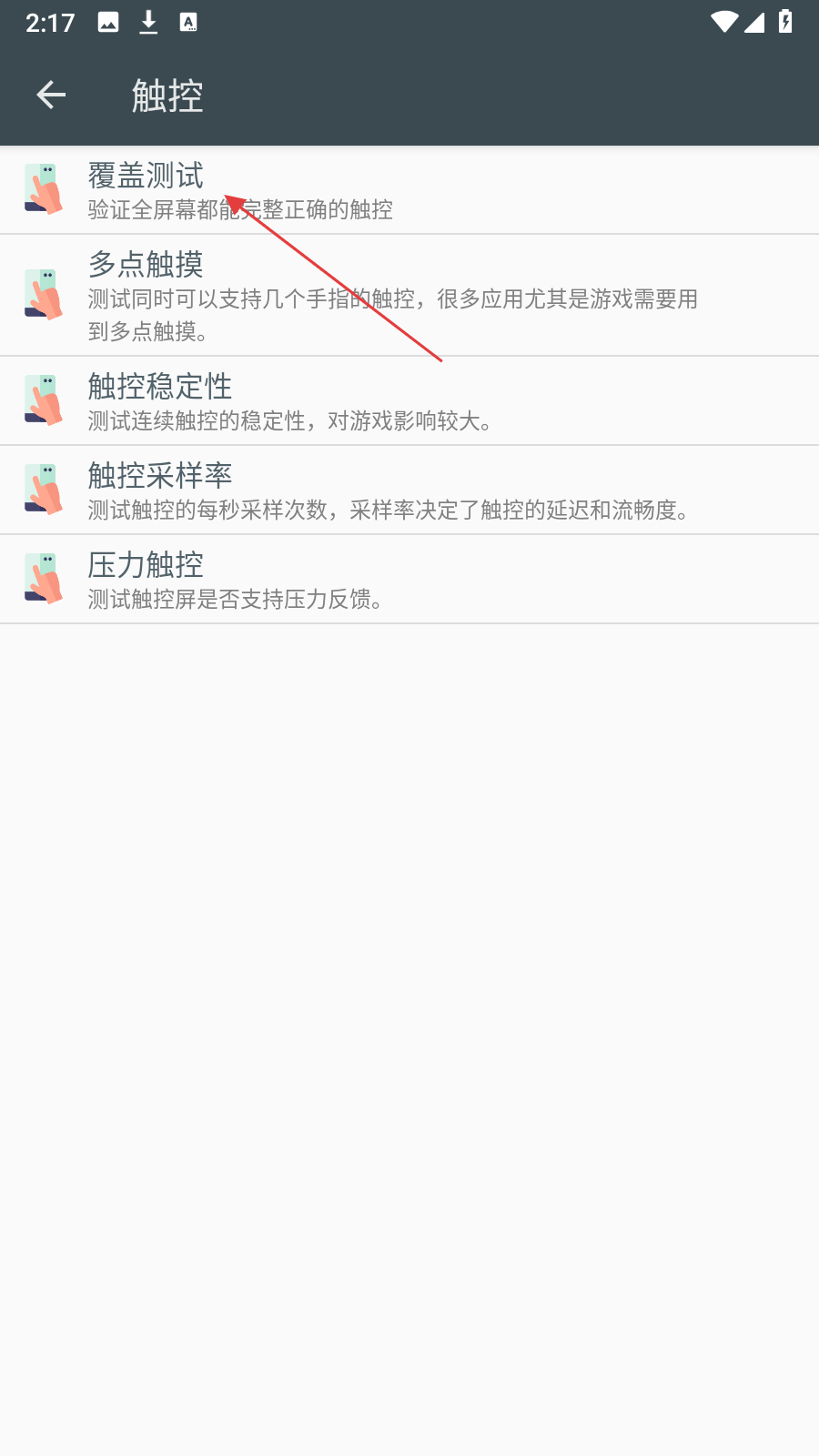 2、在触控测试页面中,选择覆盖测试选项,进入覆盖测试界面,点击开始测试按钮。