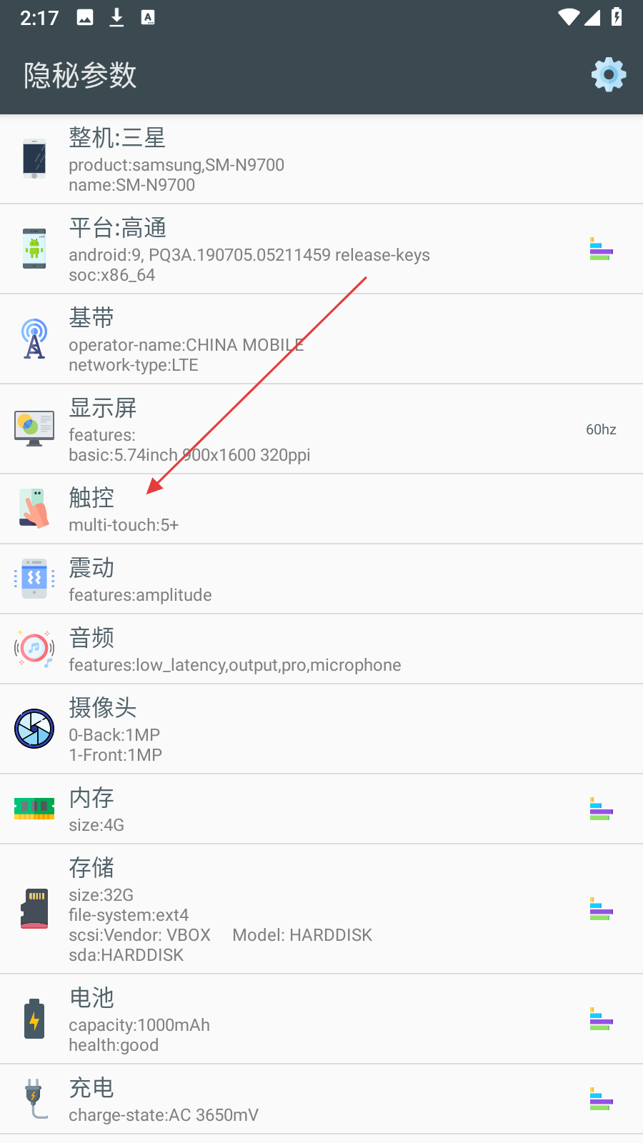 1、打开隐秘参数应用,在隐秘参数页面中找到触控选项,点击进入触控测试页面。