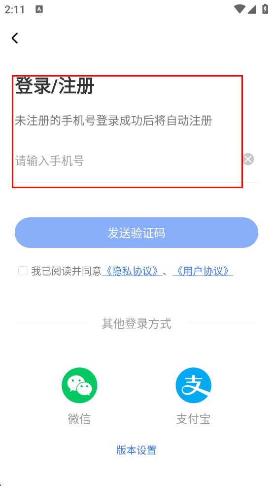 3、在登录/注册界面,输入手机号码,勾选“我已阅读并同意《隐私协议》、《用户协议》”,点击“发送验证码”,输入收到的验证码,即可完成登录。