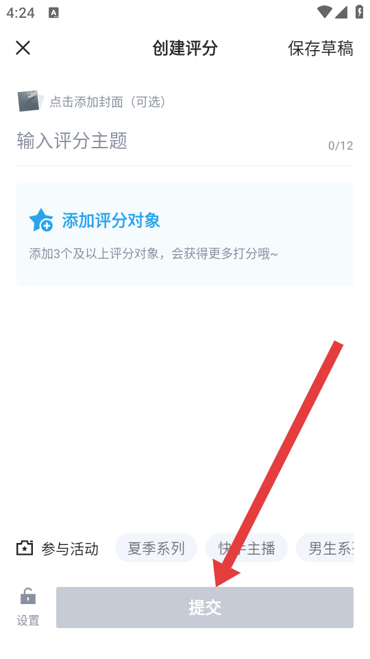 3、在创建评分界面,输入评分主题,添加评分对象等,完成后点击提交,等待审核通过即可创建成功。