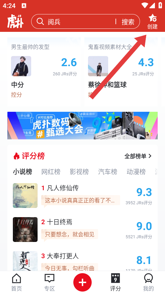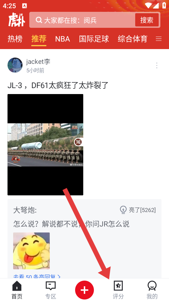 1、打开虎扑APP的首页,然后再点击底部的评分的栏目,进入评分的页面。