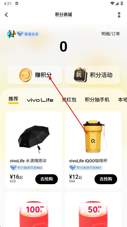 3、进入积分商城页面,点击赚积分,获得更多积分。