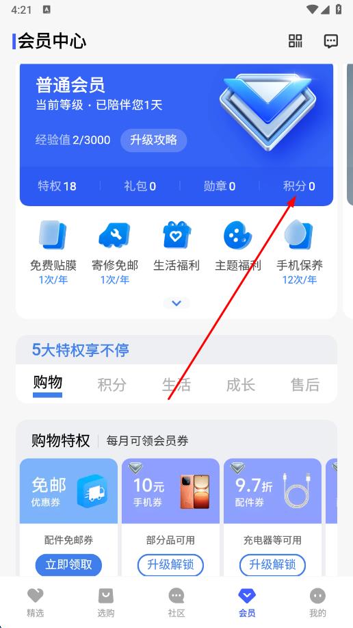 1、打开vivo商城APP,点击底部导航栏中的会员选项,进入会员中心页面。