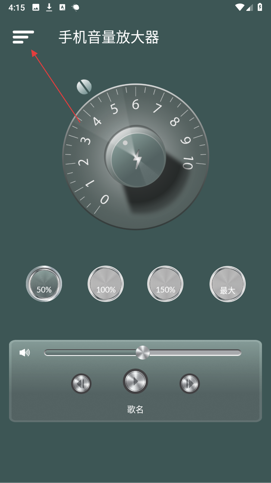 1、打开手机音量放大器应用,点击界面左上角三条横线的菜单按钮,进入设置页面。