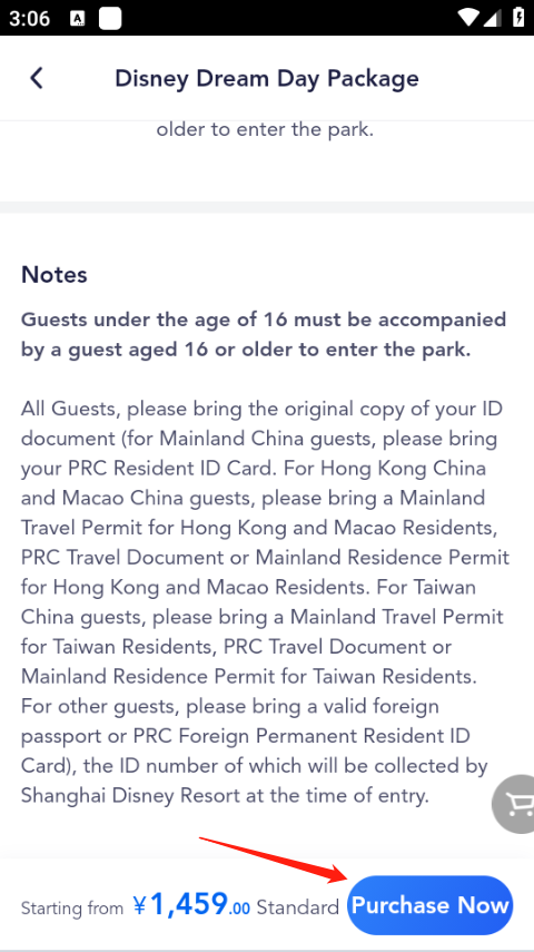 4、你需要在这个界面往下滑阅读完买票条款才能点击立即购买。