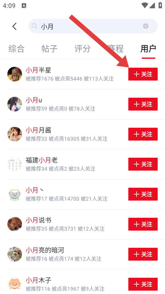 3、在用户列表里,找到目标用户,点击其右侧的+关注按钮,即可成功关注该用户。