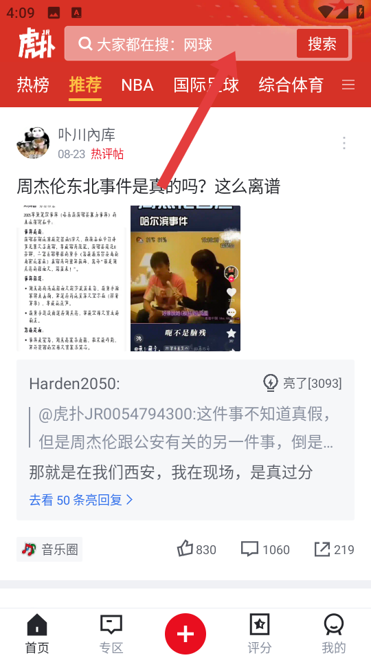 1、打开虎扑APP,在首页顶部的搜索栏中输入要关注的用户名称,点击搜索。