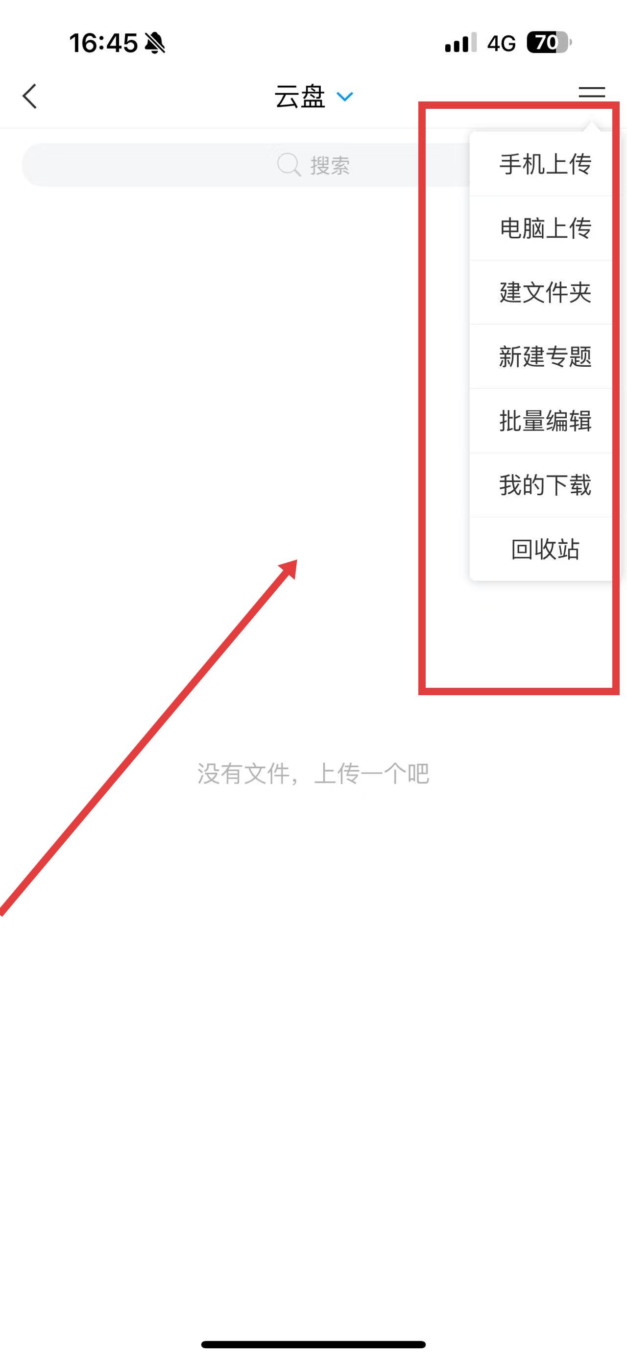 3、在云盘界面点击右上角菜单,选择手机上传或电脑上传 ,将作业文件上传至云盘后,在作业提交处选择对应文件提交。