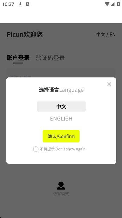 1、打开app,用户们先选择语言“中文”,再点击“确认”