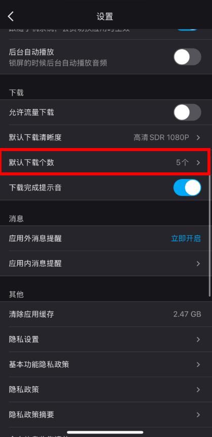 2、在设置页面中,找到并点击默认下载个数选项。