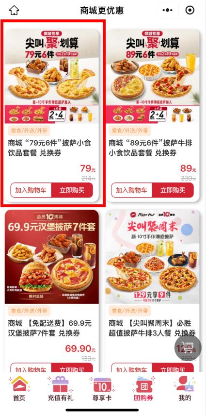 2、在团购界面浏览各类团购套餐,选择想要购买的套餐点击加入购物车或立即购买。