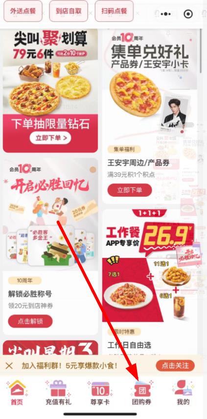 1、打开必胜客进入首页,点击底部导航栏中的团购券选项进入团购界面。