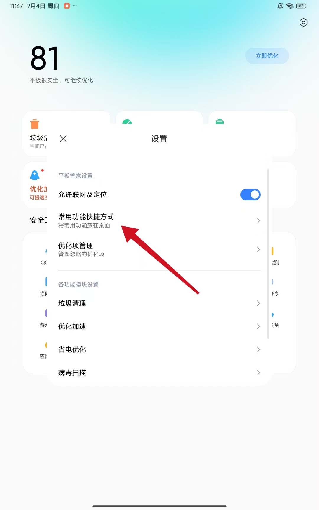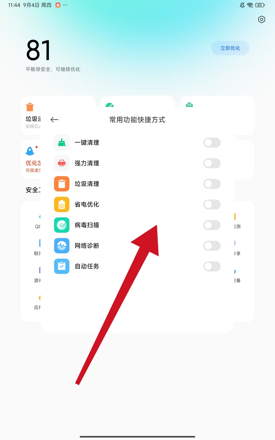 3、在常用功能快捷方式页面,找到想要添加到桌面的功能,如垃圾清理、病毒扫描等,打开其右侧对应的开关按钮,即可将该功能添加到手机桌面。